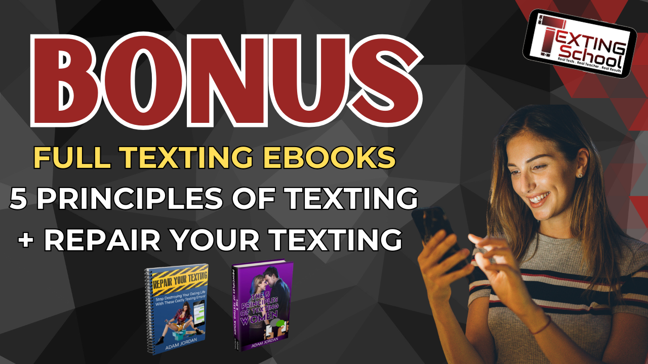 InsideTexting School you will get access to both of my full texting ebooks: Repair Your Texting and The 5 Principles of Texting Women. You also get access to the audiobook versions to listen to on the go. These ebooks are designed to help you stop getting 'ghosted' and start creating engaging text conversations with women.